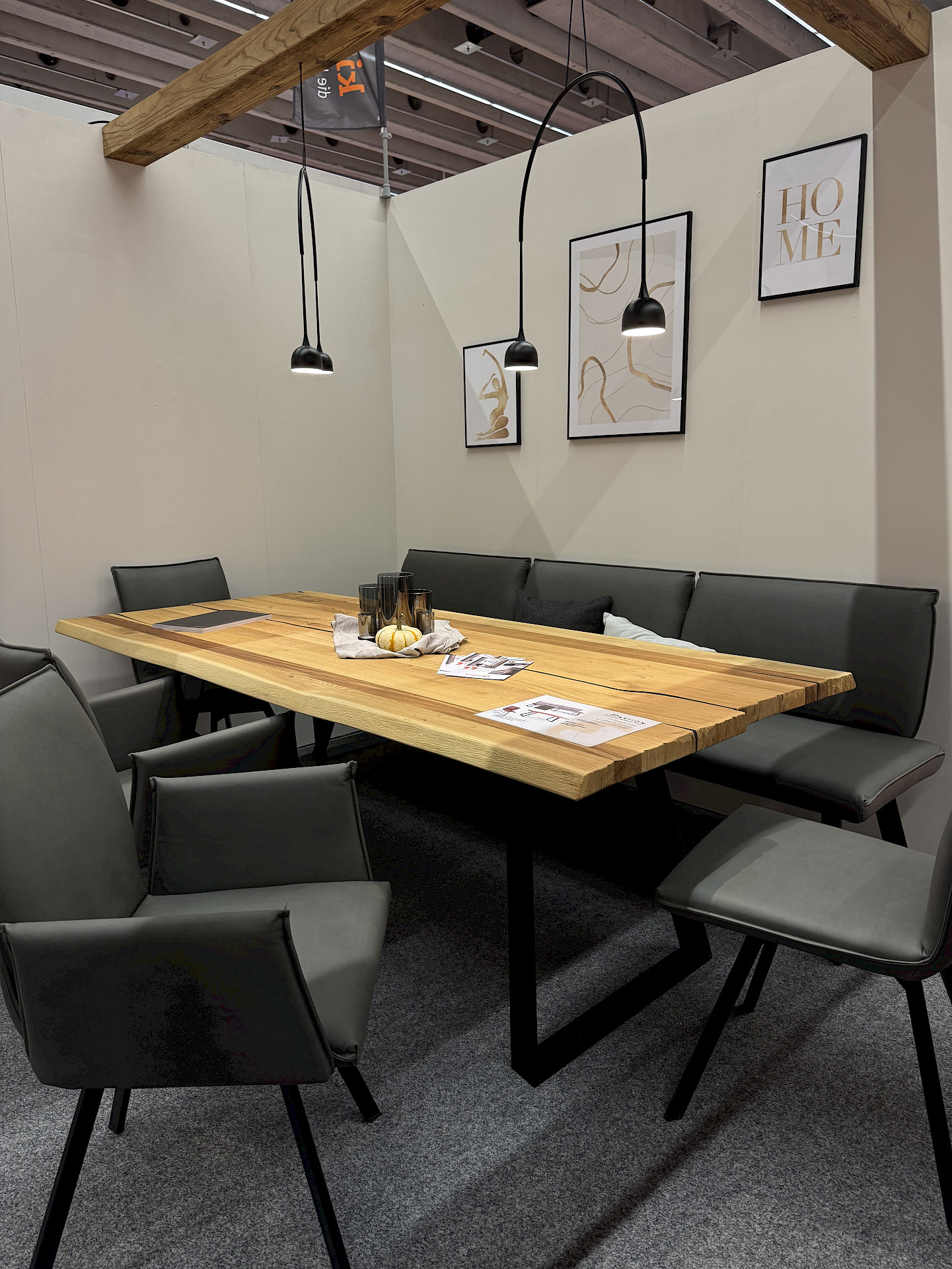 Die bequeme Eckbank und die eleganten Stühle mit weicher Polsterung in edlem Anthrazit sorgen für höchsten Sitzkomfort – ideal für lange Abende mit Familie und Freunden. Das stabile schwarze Metallgestell unterstreicht den modernen, industriellen Look.