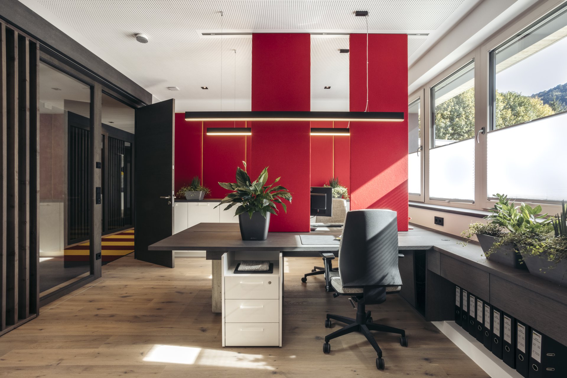 Dieses Bürogebäude ist eine Kombination aus rohen, industriellen Materialien und eleganten, funktionalen Akzenten. Beton trifft auf Holz, weiche Stoffe und warmes Licht - und erschafft so einen Raum, der sowohl inspiriert als auch zum produktiven Arbeiten anregt.