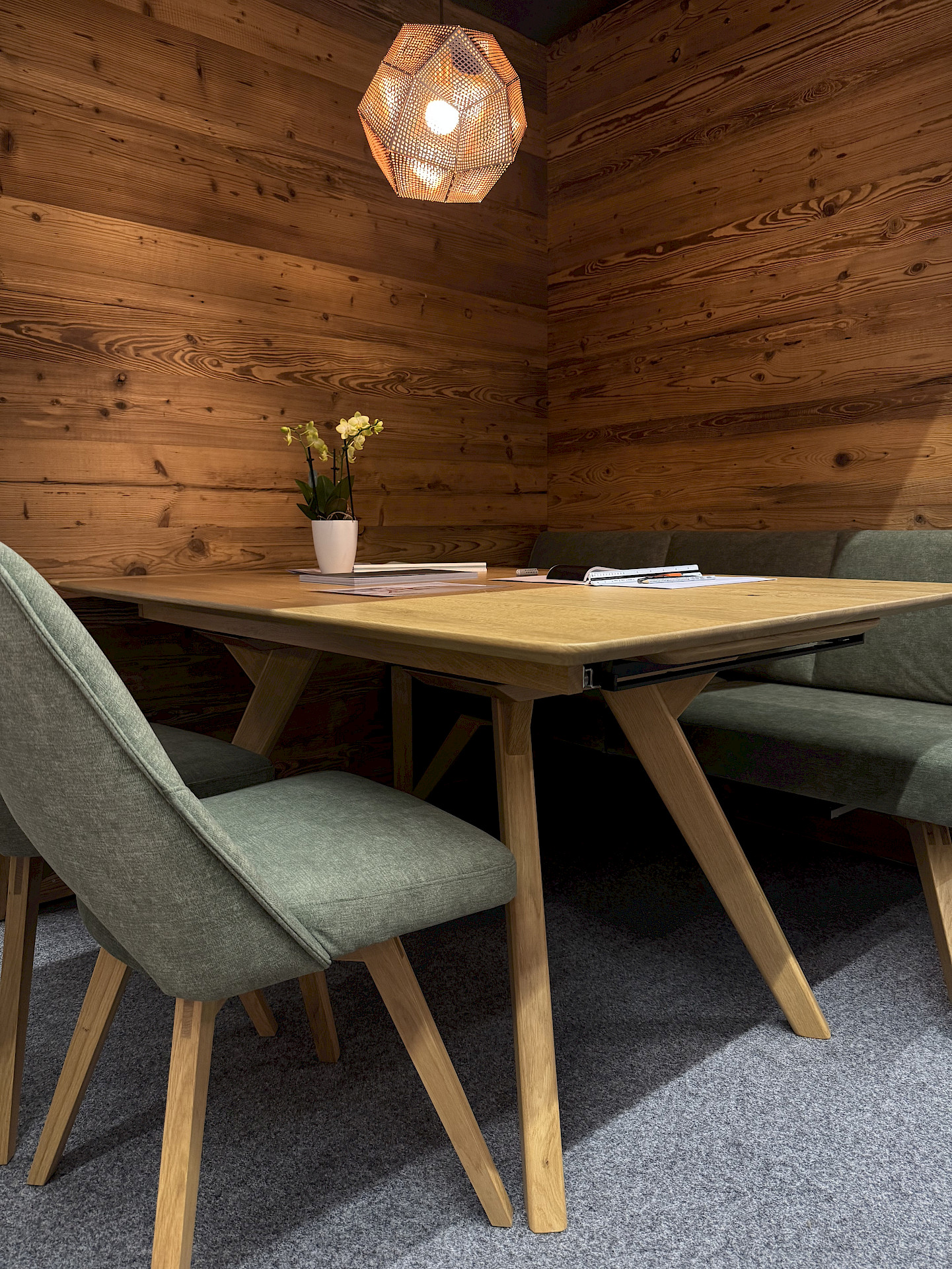 Moderne Essgruppe im skandinavischen Stil – gemütlich, elegant und zeitlos.