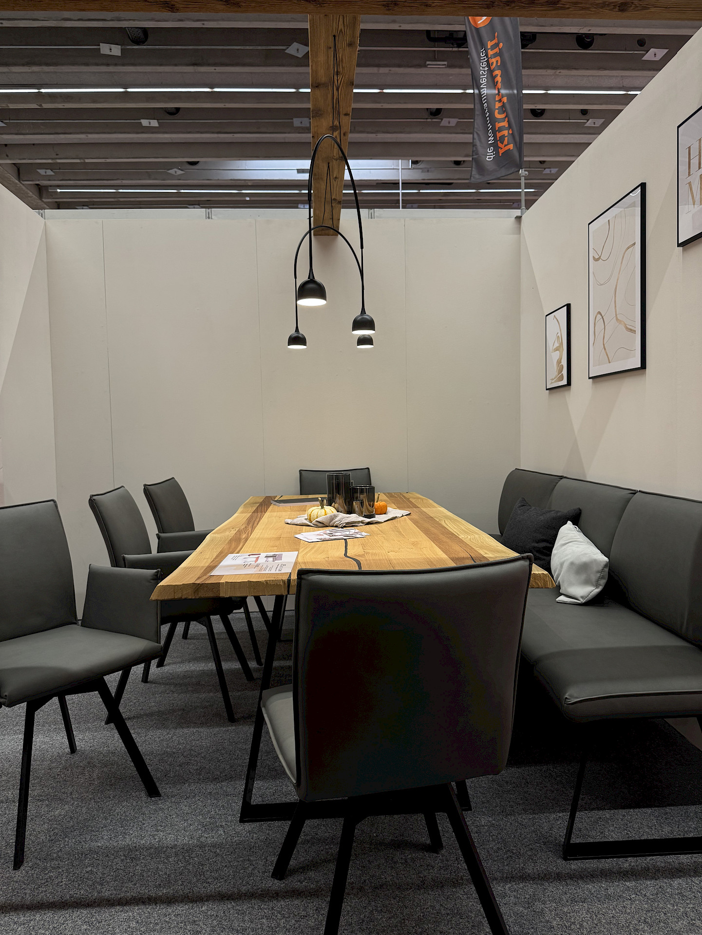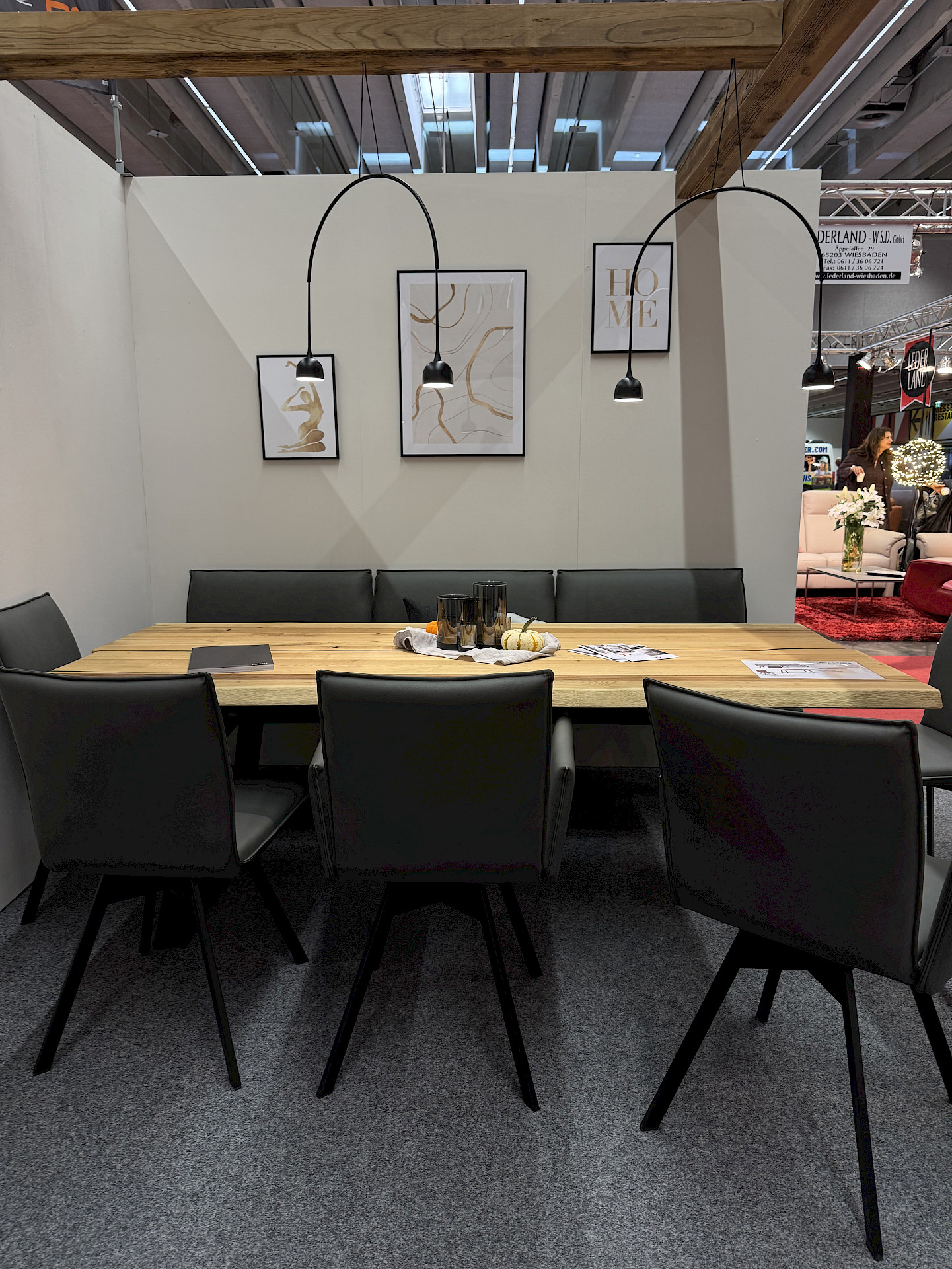 Die bequeme Eckbank und die eleganten Stühle mit weicher Polsterung in edlem Anthrazit sorgen für höchsten Sitzkomfort – ideal für lange Abende mit Familie und Freunden. Das stabile schwarze Metallgestell unterstreicht den modernen, industriellen Look.